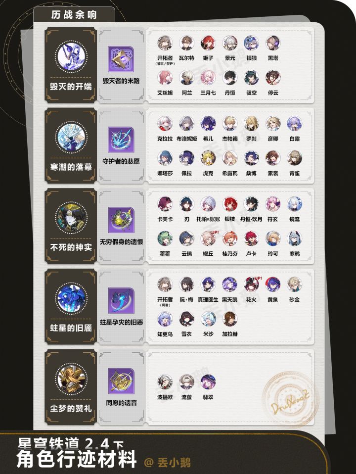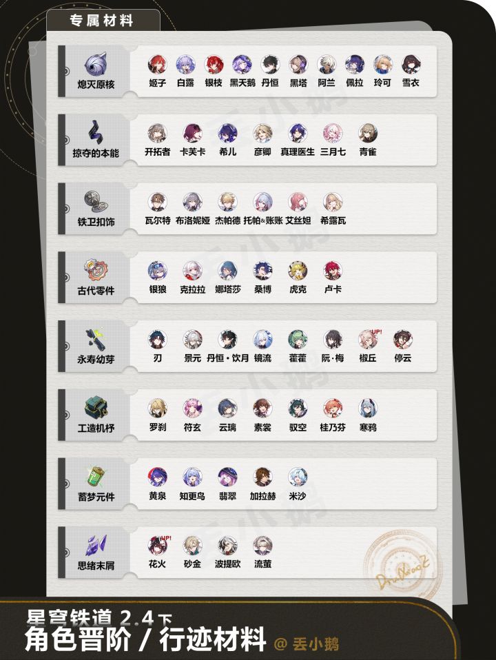 我是丢小鹅,为你带来【星穹铁道2.4】全角色晋阶材料、行迹材料。