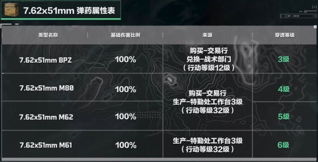 7.62x51mm M80和7.62x51mm M62则分别是4级弹药和5级弹药,既可以在交易行购买,同时也可以在工作台进行生产。而7.62x51mm M61最为特别,作为只能在工作台生产的6级弹药,它对护甲的伤害能力极为优秀,面对1~6级护甲均能造成120%的甲伤。