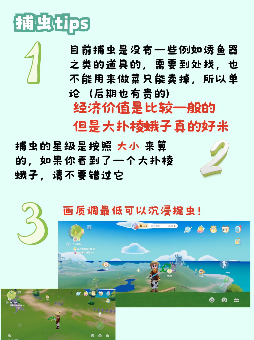 2.捕虫的星级是按照 大小 来算的,如果你看到了一个大扑棱蛾子,请不要错过它