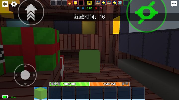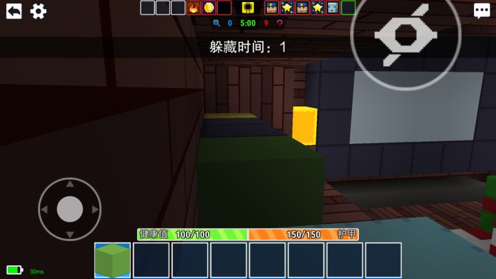 躲藏者在游戏开始后,有数十秒钟的躲藏时间,屏幕上会显示许多方块供躲藏者选择,躲藏者在选好方块后,点击“确定”,即可变成该方块,然后寻找藏身之处。在找到合适的躲藏位置后,点击图2中的绿色按钮,等待几秒钟之后,即可固定自身位置,融入到周围环境,实现“躲藏”,绿色按钮会变成白色按钮。“躲藏”状态下,玩家只能转动视角方向,观察周围环境,无法移动。点击图3 中的白色按钮,即可退出“躲藏“状态,重新获得移动能力。