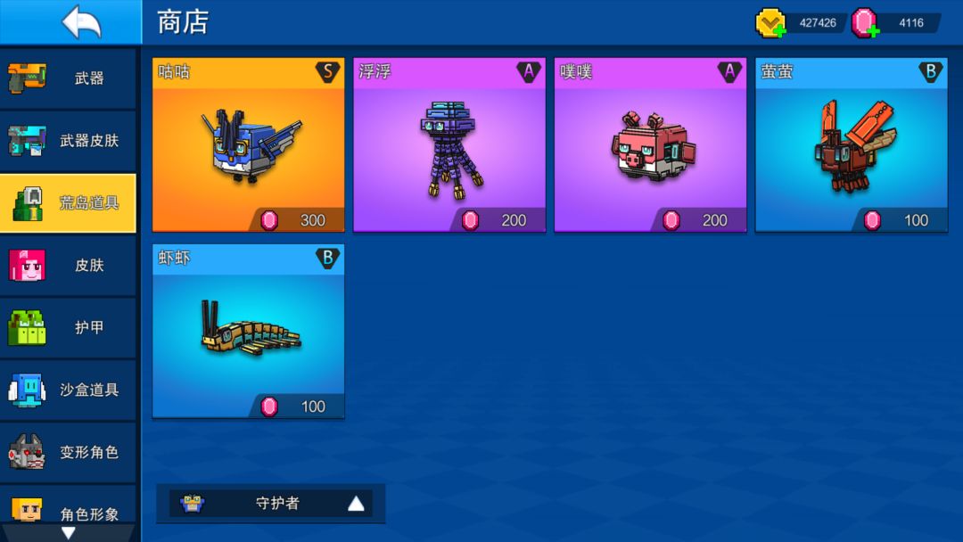 当然玩家还可以在商店中购买不同的战略道具与守护者。战略道具有重型机枪、地雷、喷气背包等(如图5),可以在游戏中助玩家一臂之力。守护者也有许多种类(如图6),可以增强玩家的护盾值,也可以在玩家捡到武器时提供随机属性buff,增强玩家实力。