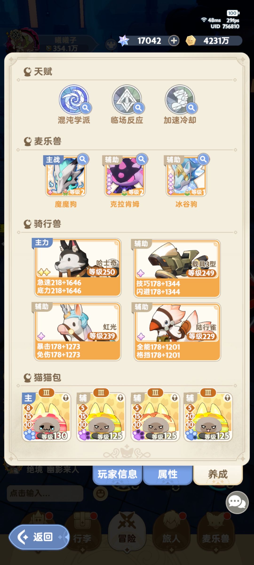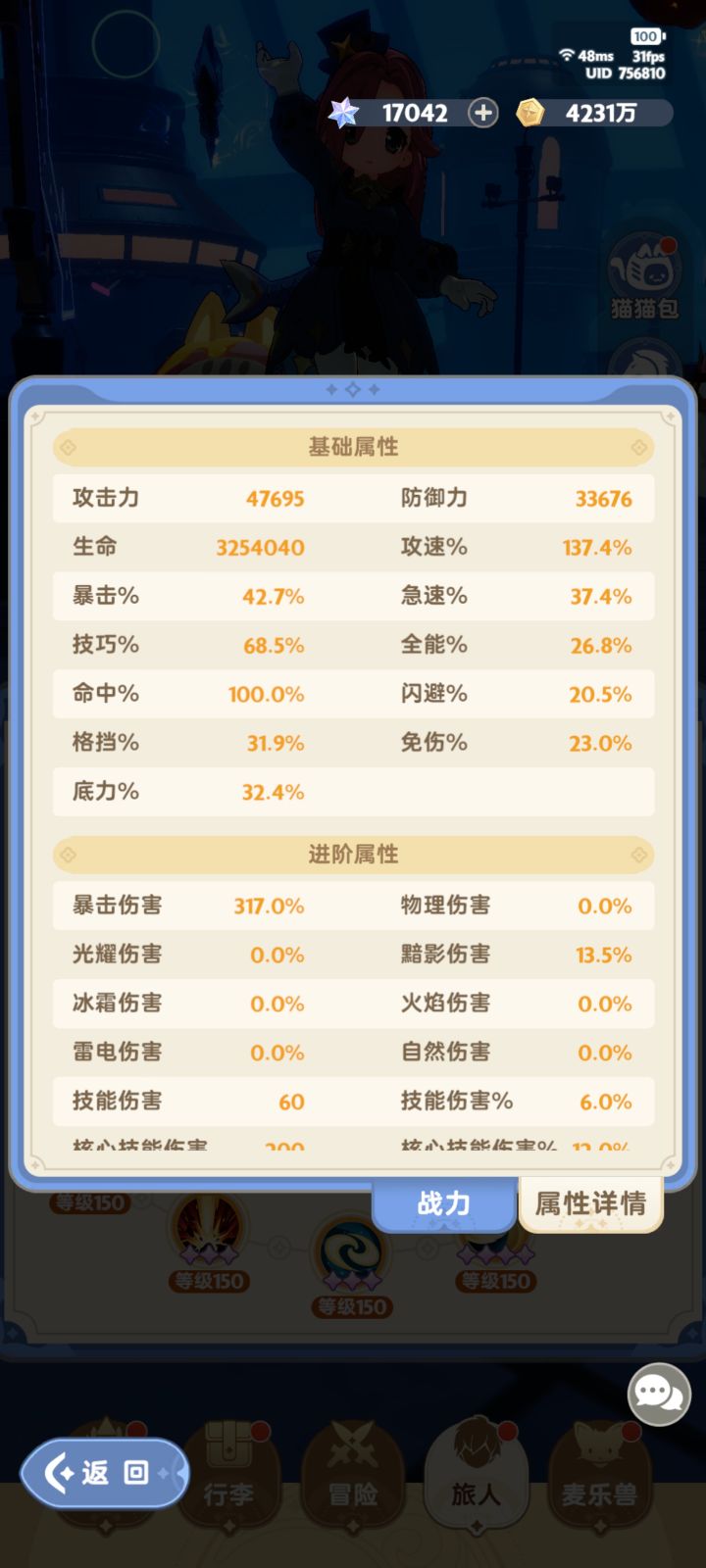 图3 命中100%(自己算,如果打龙要满命中得溢出4%左右),技巧最优先(因为输出集中在核心,且必定暴击,暴击率收益只有天赋给的一点增伤,很有限),其次极速≈全能,技能冷却12%左右比较好。[不建议过早专属技能升紫4星,卡好12%冷却]