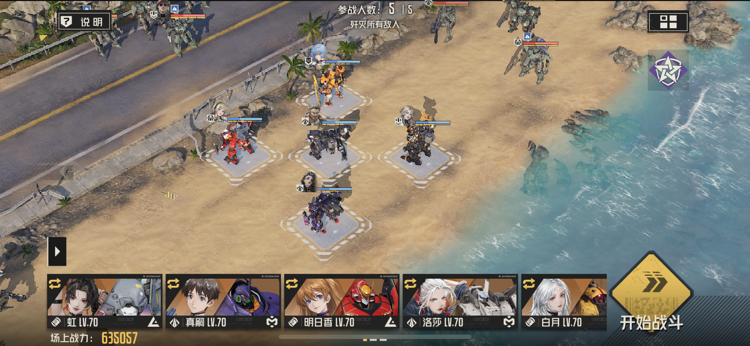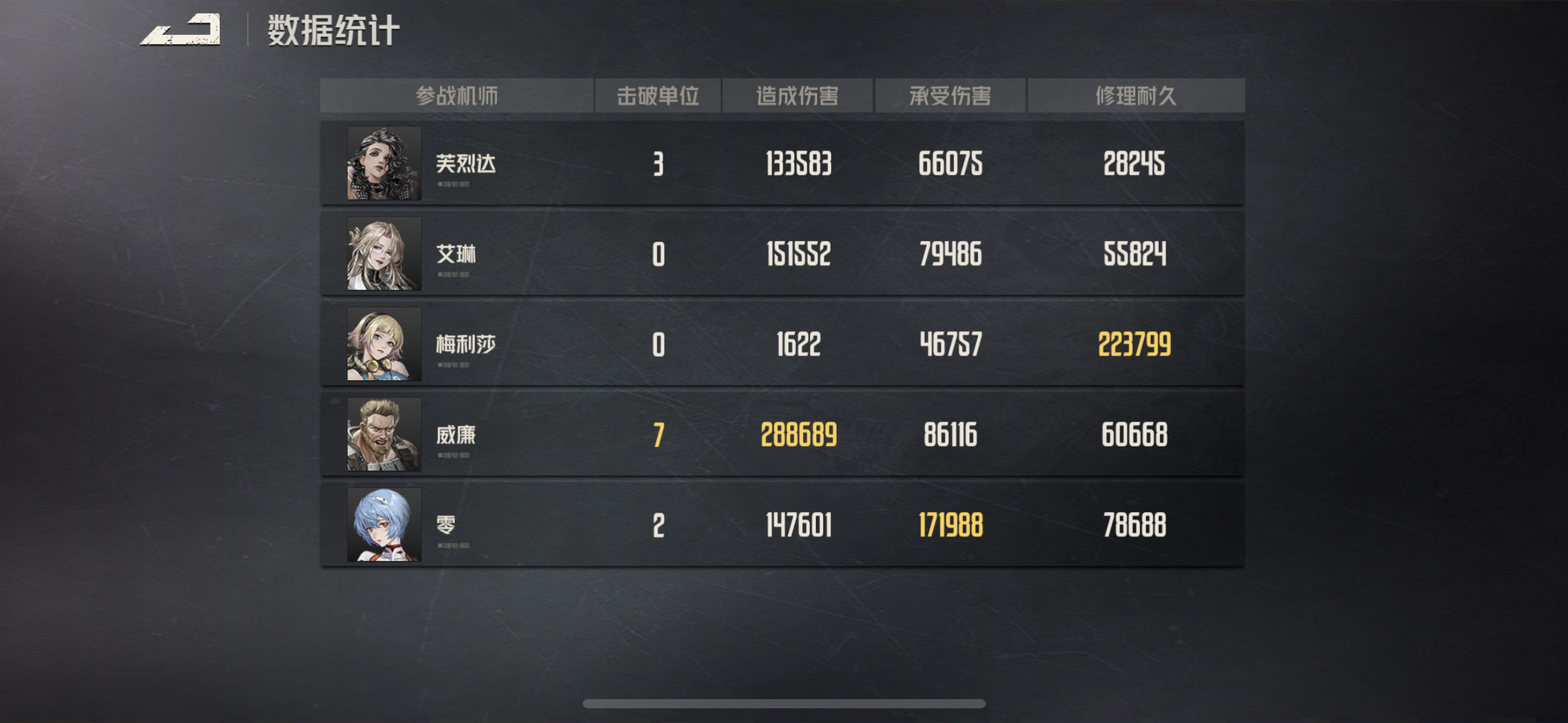 14-3打不过去,只能打过14-2,先打左边的三台机兵,以威廉攻击为主,威廉好用。出场阵容战力635057:威廉(2命/16+7/彩金刚/出力破甲包)、芙烈达(3命/16+7/彩暮色/移动破甲包)、艾琳(1命/1+16/彩马尔萨斯/银闪模组)、梅丽莎(3命/1+16/金2金3开拓者)、凌波零(2命/1+10/金3零号机)。
