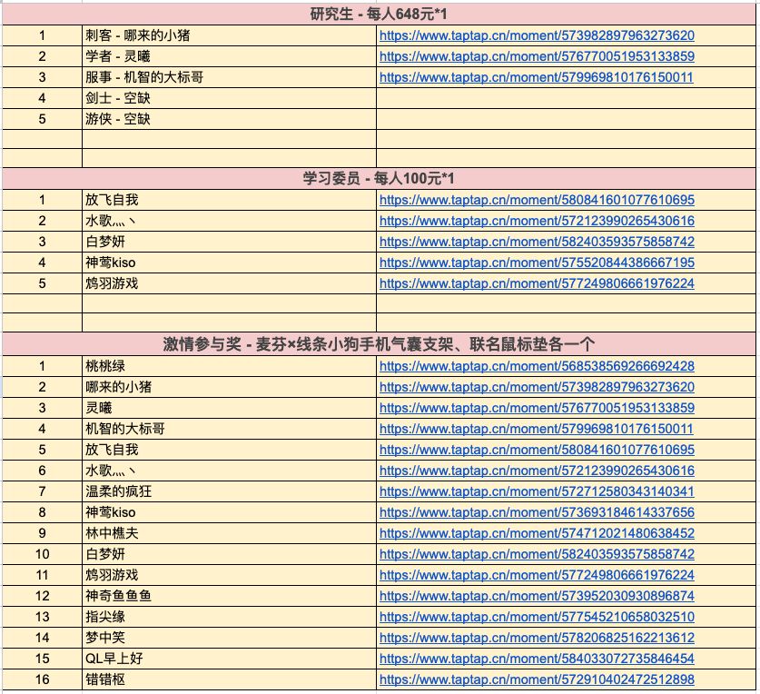 - 【学习委员】5名:好攻略,对推图、打本有参考,每人将获得「100元现金」奖励;