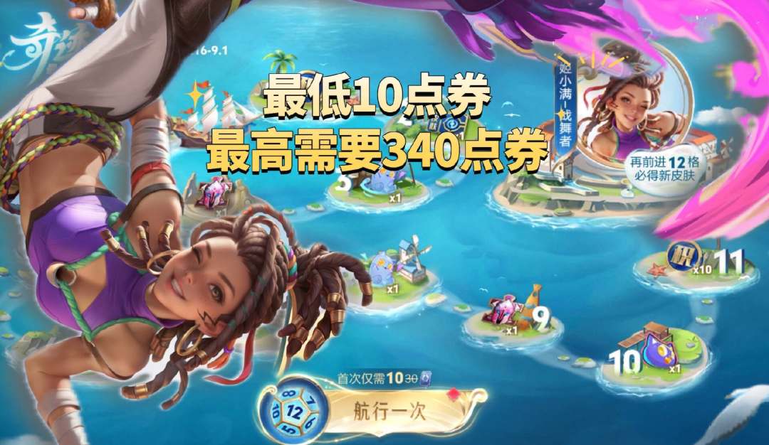 所以在本次活动中,官方出了一个超级优惠活动,首次购买航行仅需要10点券。因此理论上来说,我们的第1个骰子就有概率直接投到12点,然后直接前进到最终奖励。看到这里相信大家应该明白所谓的最低一元是什么意思了?二、这款皮肤最贵需要多少点券?