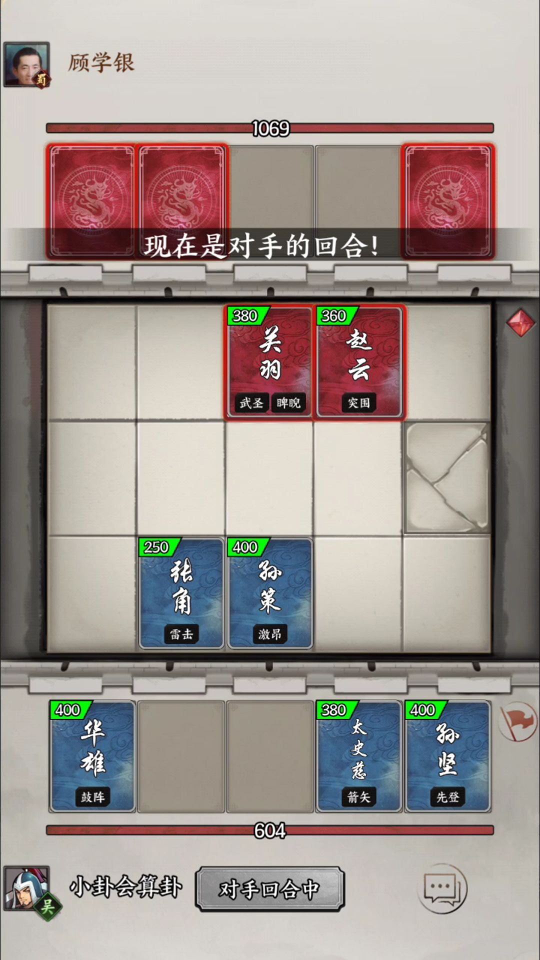 这个就有点悬了。一来我卡牌不好。二来我城墙血不够。三来对面还是个高手。