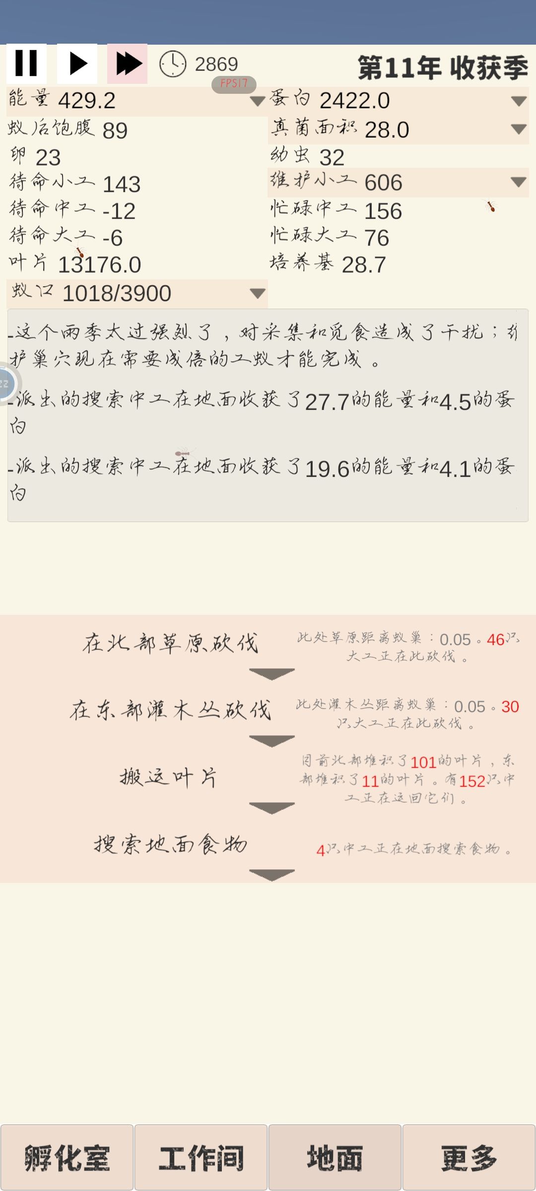 主要是这个蚂蚁养多了后,以后的产出就有点跟不上了。产出的小工没办法数量太少。叶片太多小工的数量跟不上。导致培养期基的产出也跟着减少了没办法维持下去,真菌面积也会跟着减少。在遇到雨季的话,小工全部都没了。导致好不容易攒起来的真菌面积减少只能用手点维持。希望能出一个设置多少小工具搬运叶去制造培养期