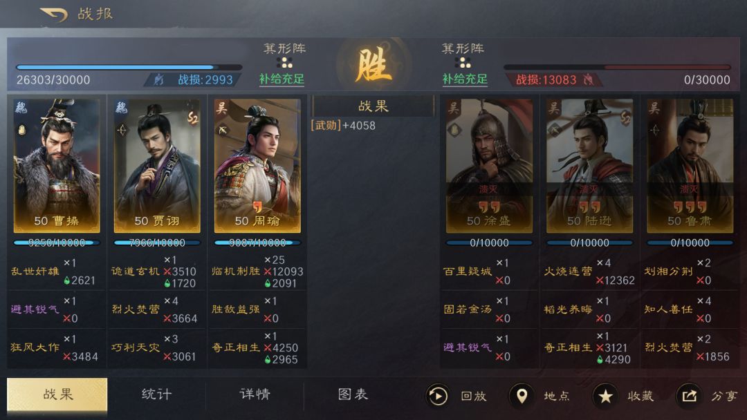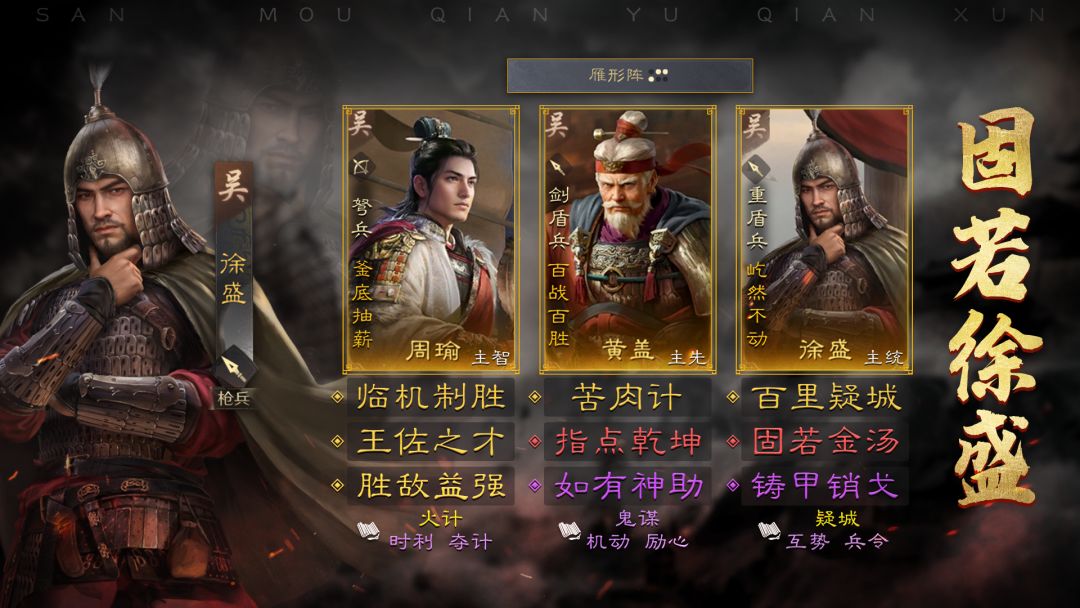 该阵容利用徐盛的高统率和【固若金汤】的百分比统率加成,使得徐盛触发抵御的概率非常可观,从而保证了整个队伍的抗伤能力;黄盖利用【苦肉计】和【指点乾坤】在促进周瑜输出的同时也能更快的叠满【胜敌益强】。