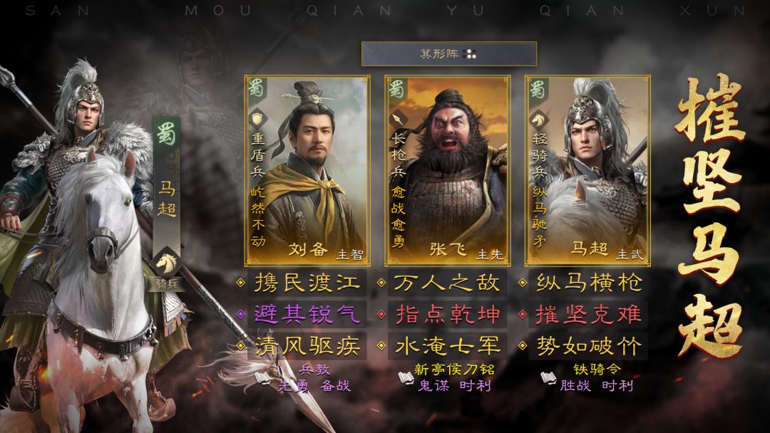 通过【摧坚克难】的稳定会心加成,马超可以实现稳定的输出能力;张飞的高先攻和带来的稳定“畏惧”效果,可以配合【指点乾坤】提升马超输出,同时也能触发【纵马横枪】的追加伤害。
