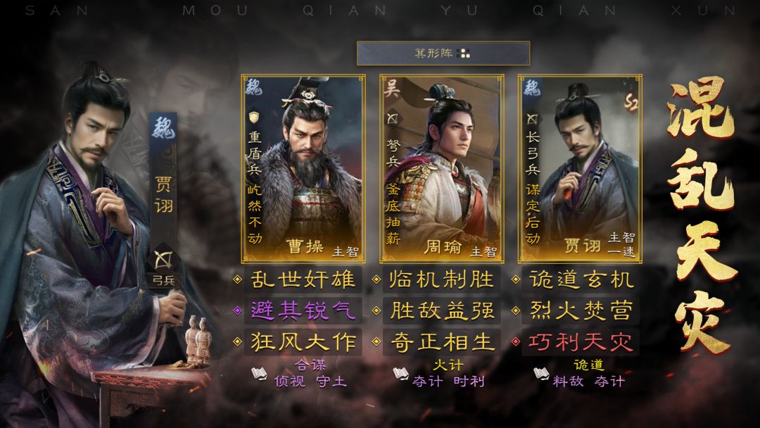 贾诩选择长弓兵,兵种专精选择“谋定后动”:对敌军施加控制状态时,有65%概率额外令目标智力、统率降低10点,持续1回合。