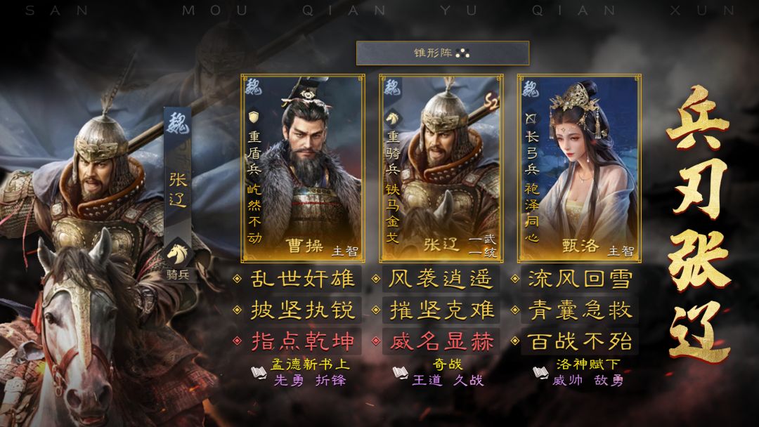 这套阵容主要利用【指点乾坤】与甄洛的增伤,大大提高张辽的输出能力,配合张辽自带战法【风袭逍遥】锁定后排的效果,能够快速的击败对面后排武将。