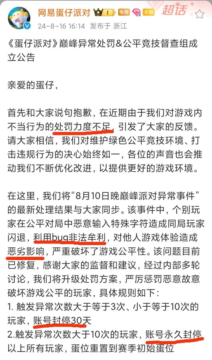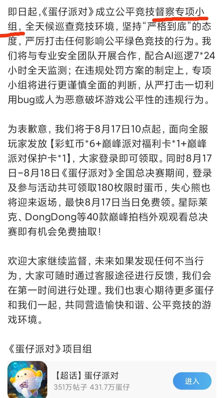 8/16号下午,《蛋仔派对》发布公告称: