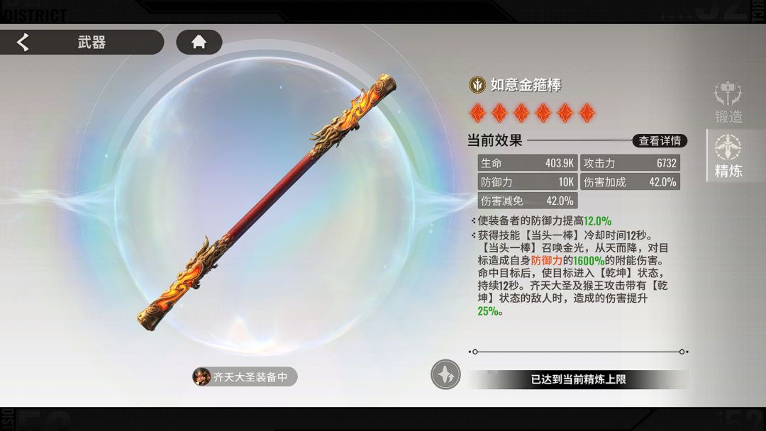专武效果,提高12%防御力,获得新技能【当头一棒】12秒冷却,对目标造成自身1600%防御力的附能伤害,并对目标施加状态【乾坤】持续12秒,分身和本体攻击乾坤状态下的目标造成伤害提升25%(1600%系数,恐怖如斯)