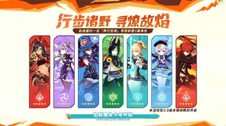 每位参与玩家可在「奔行世间」常驻祈愿池中挑选获得一名5星角色。