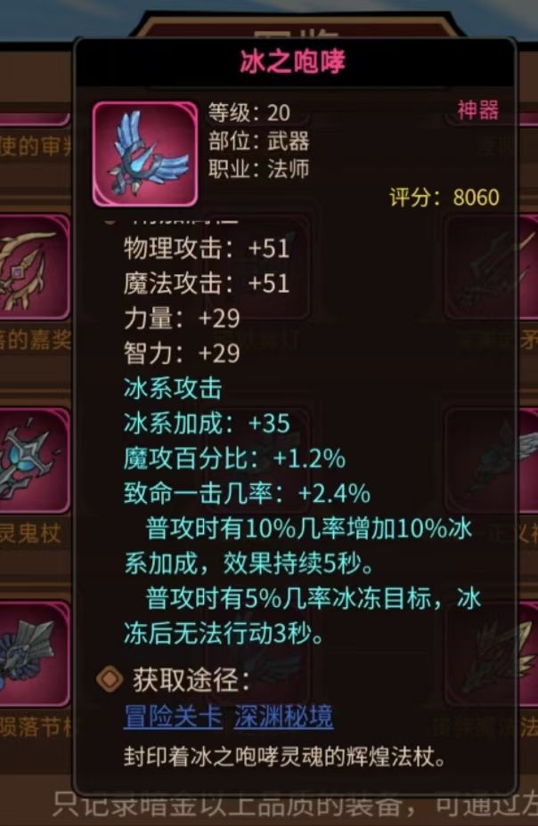 金杖的数值非常超前,而且有很强的推图能力,明显是骗氪产物。满级金杖的数值和强化+10冰咆哮相当,但金杖被动是固定数值的群伤,只生效一次,对单乏力。冰咆哮的冰系加成和概率冰冻更契合20级冰法套,对冰法的增益更大。并且,冰法在30级阶段的首选武器依然是冰咆哮,所以迟早需要更替。