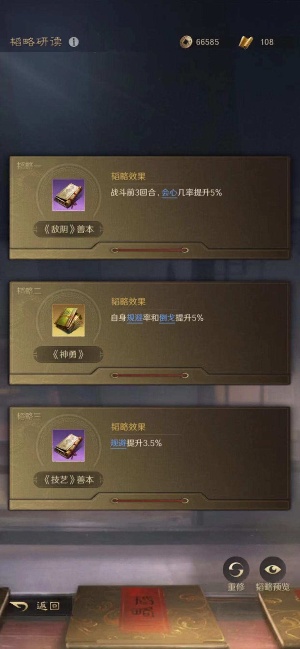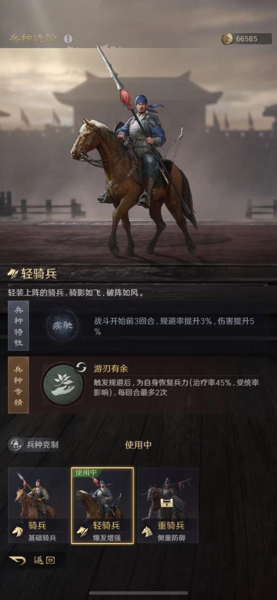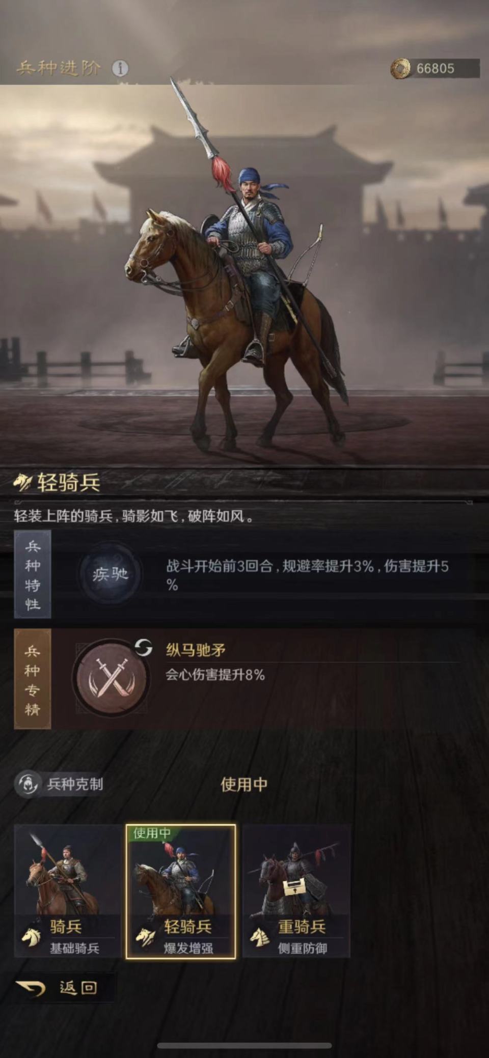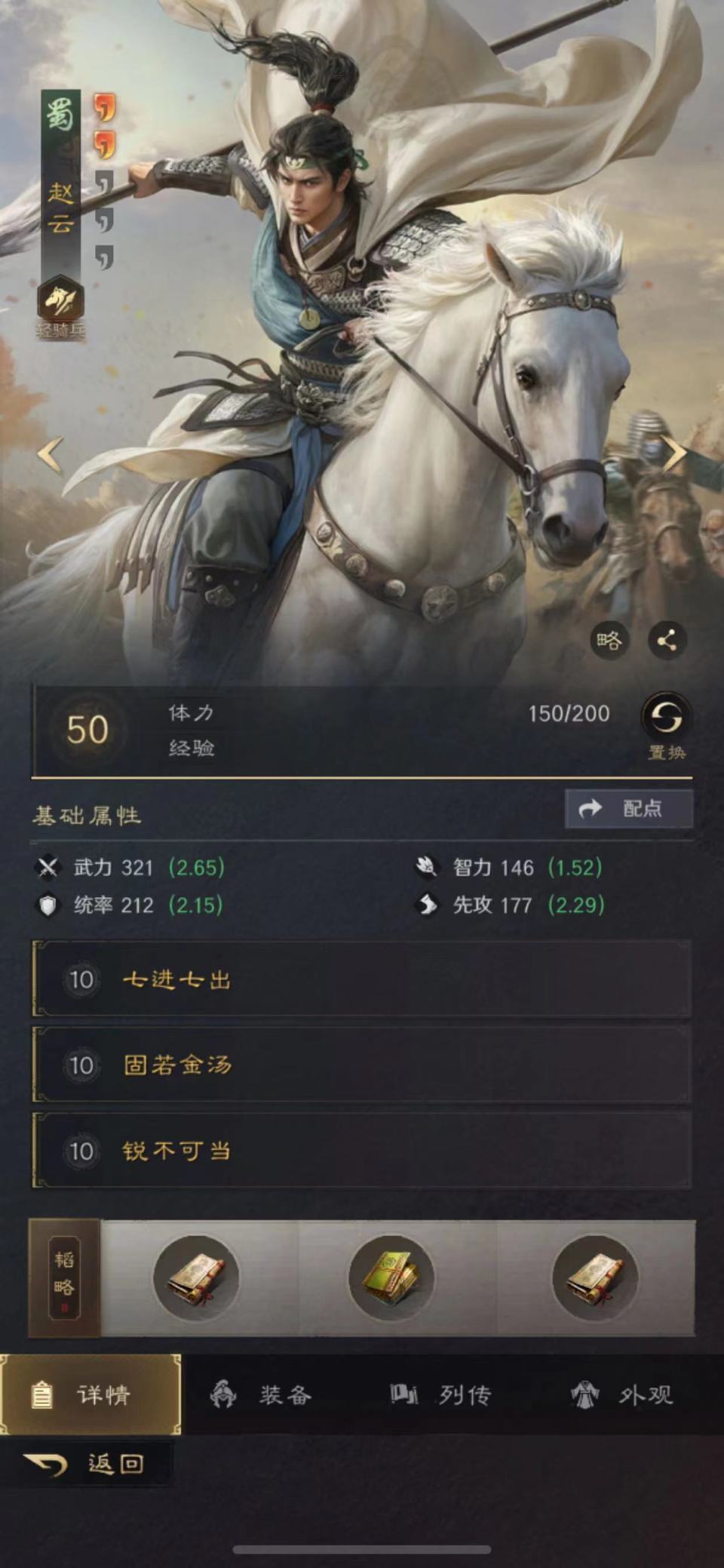 赵云的韬略库依次研读了敌阴善本、神勇金书和技艺善本。选择了轻骑兵做进阶兵种,特性为疾驰,专精点亮游刃有余。只能说这支队伍的赵云很贪心,抢人头和做保镖,他是两份工钱都不耽误啊!