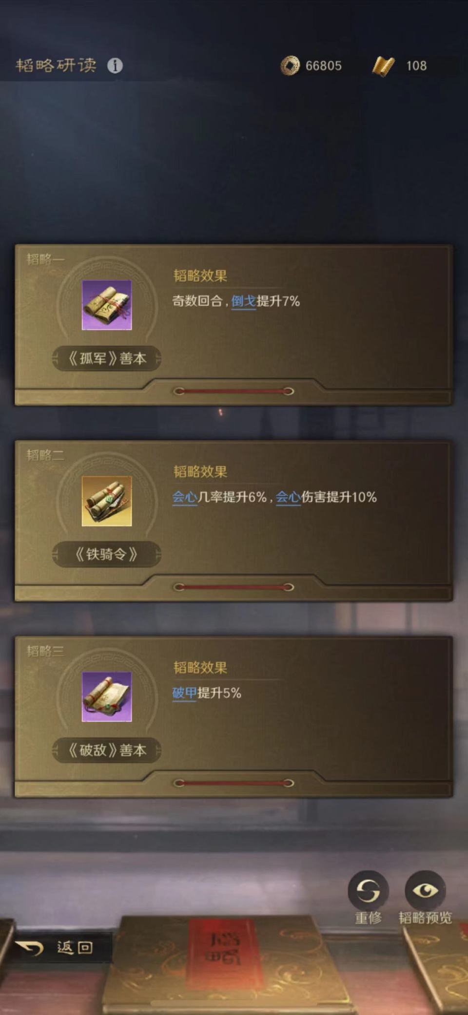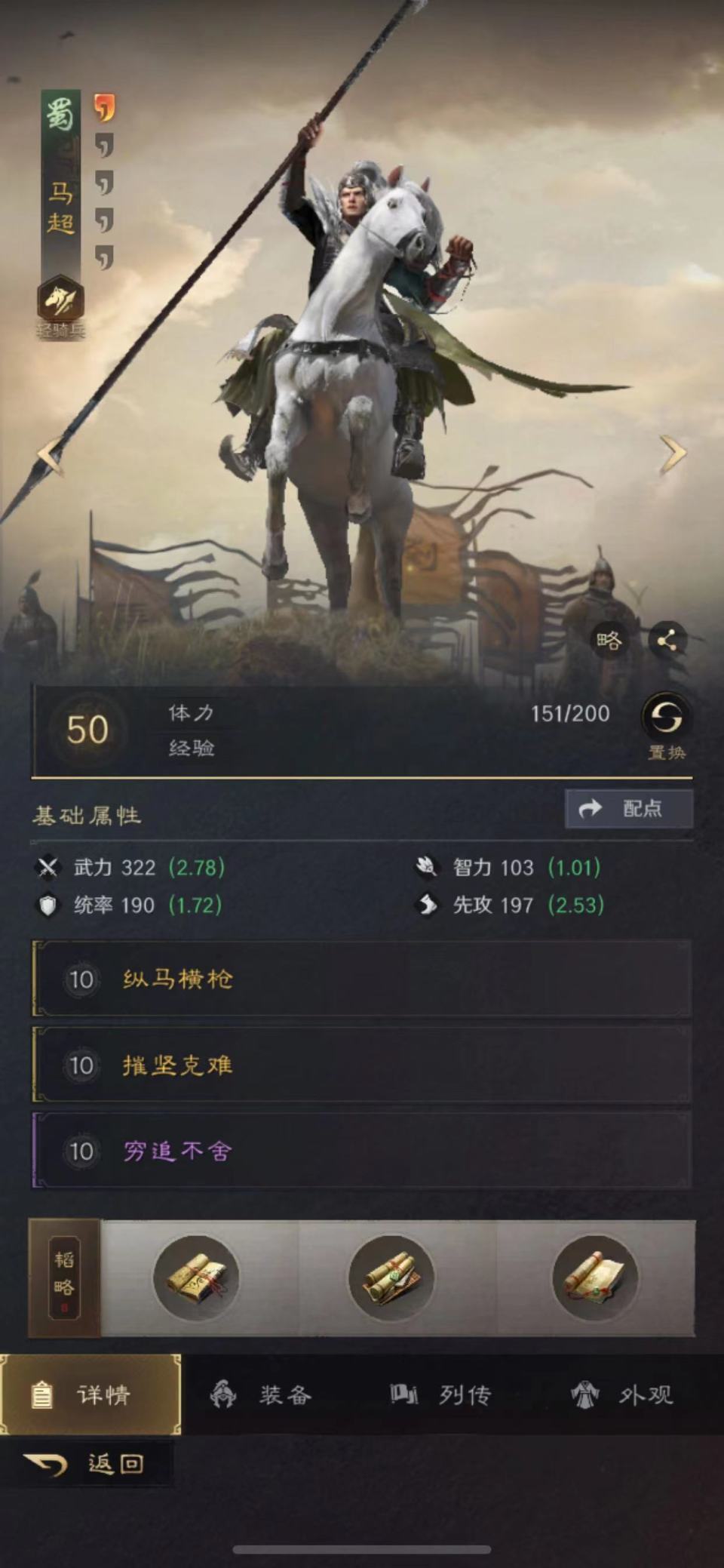 最后让马超压轴亮相,纵马横枪、摧坚克难和穷追不舍构成战法库;铁骑令、孤军和破敌的善本构成韬略库,直接摊牌就是菜刀猛砍。赵云和马超都附带了破甲属性,一旦启动必定效果惊人。