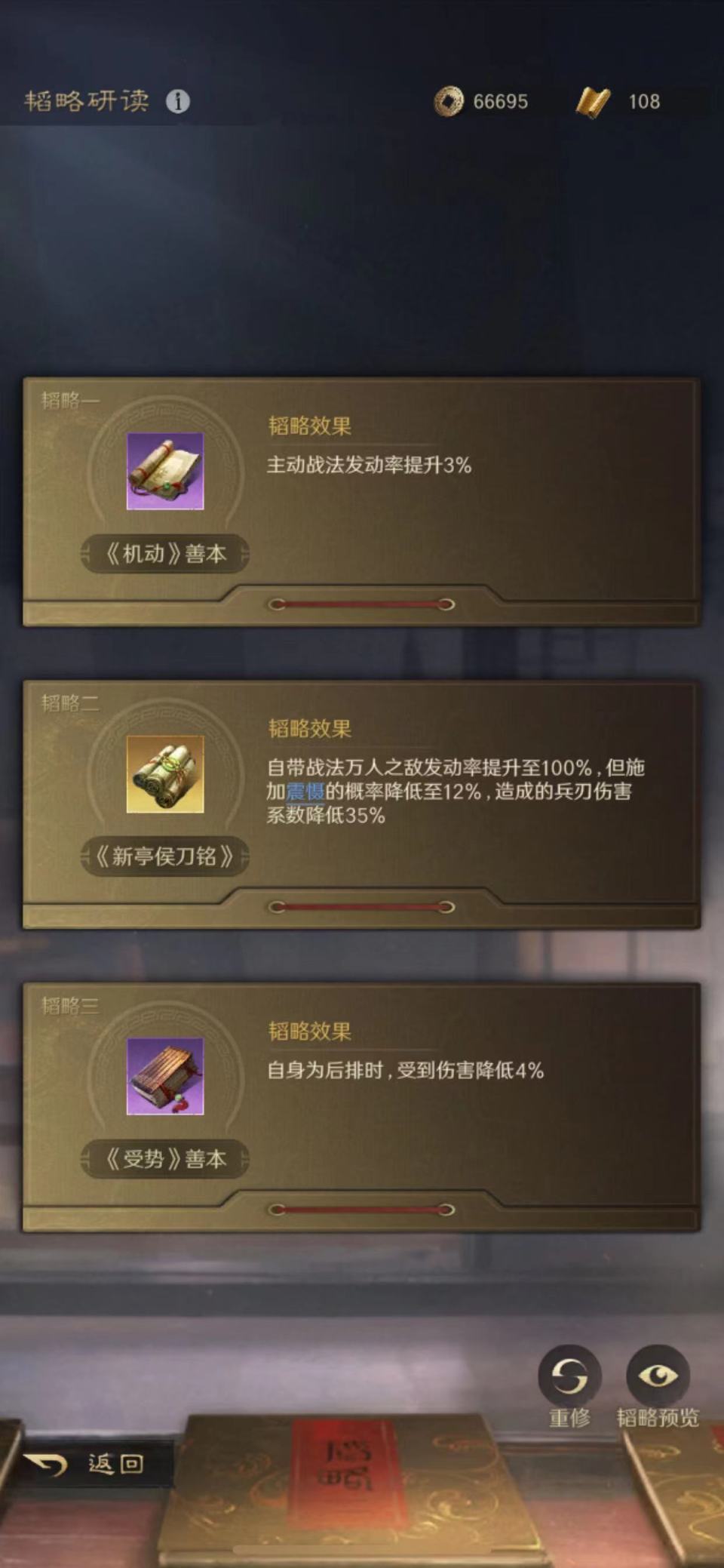 除了专属金书新亭侯刀铭之外,张飞的韬略库还额外研读了机动和受势的善本。长枪兵同时亮点破敌和愈战愈勇的操作,无疑是想要进一步给马超的输出做足铺垫。