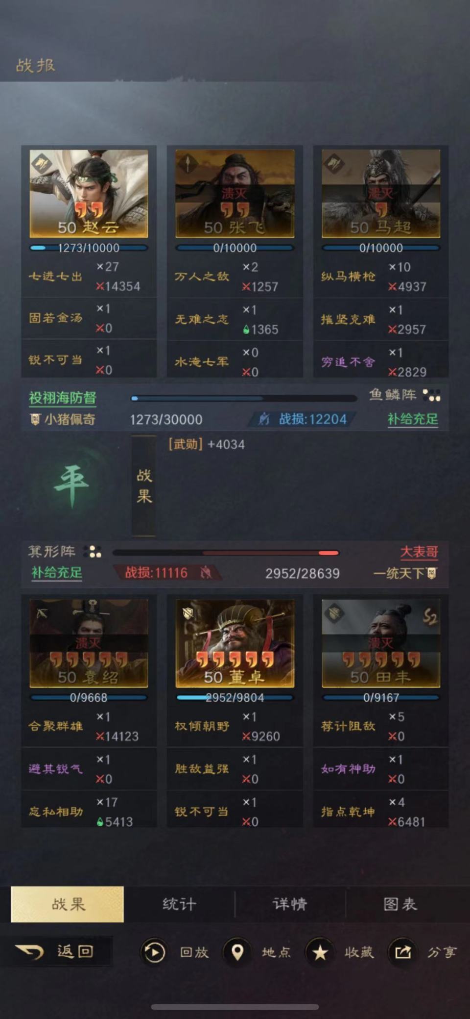 然而哪里有压迫,哪里就有反抗,哪怕是运气一时爆棚,那也是非常值得拿出来显摆一番的。在此让我们特别鸣谢游戏ID名为“祋祤海防督”的玩家朋友,就是他用麾下的赵云、张飞和马超创造了奇迹。由于对面满红的太师盾战力实在太过强大,他队伍里的张飞和马超在战斗开始的前四回合就遭到了击溃。在场上仅存赵云的情况下,他顽强的实现了惊天逆转。我相信绝大部分人看到这里都想往下瞧个明白,所以咱也是把资料都采集齐全了才敢写。