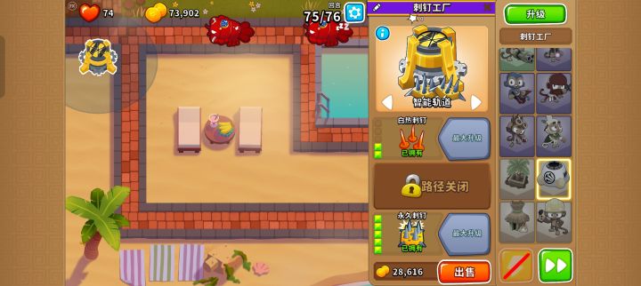 先用005大炮,等待触发掉血清屏被动。然后卖了换205刺钉工厂切智能轨道堵门,等bfb到图三所示位置左右卖了换005炼金,处理掉bfb。等待永钉清理76回合即可。