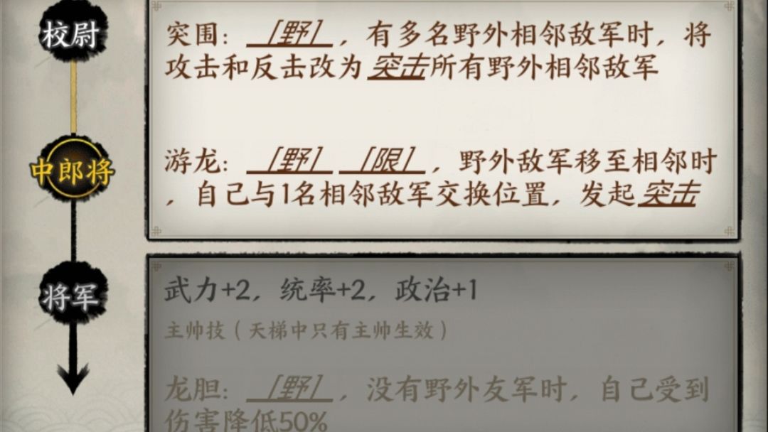 赵云:近战群伤武将,能攻击和反击相邻敌方单位所有敌军,进阶中郎将后开启游龙技能,敌军靠近与敌方交换位置并发起突击,非常强势的技能