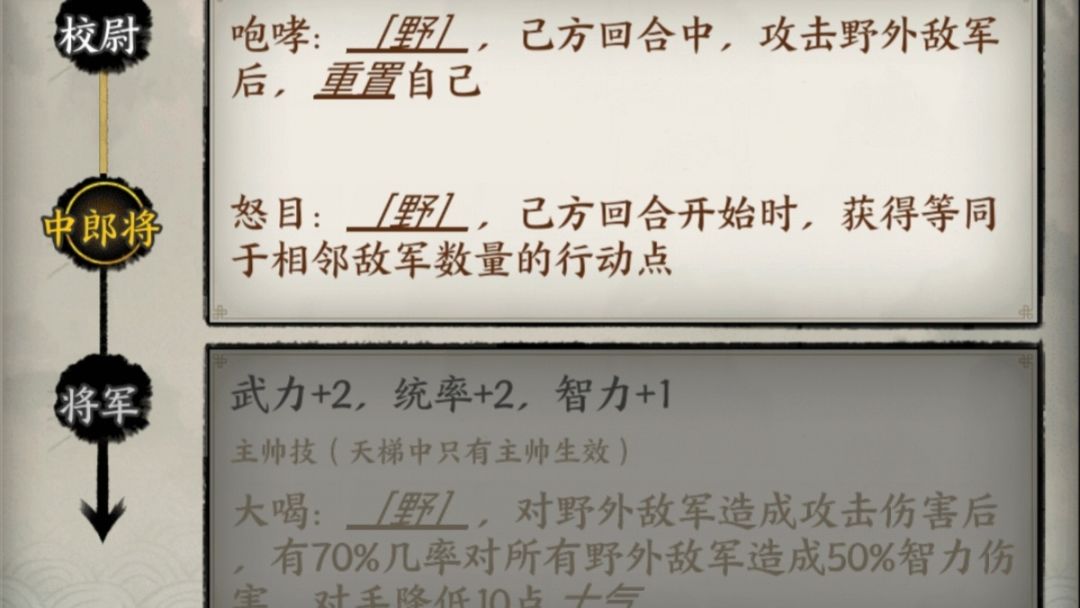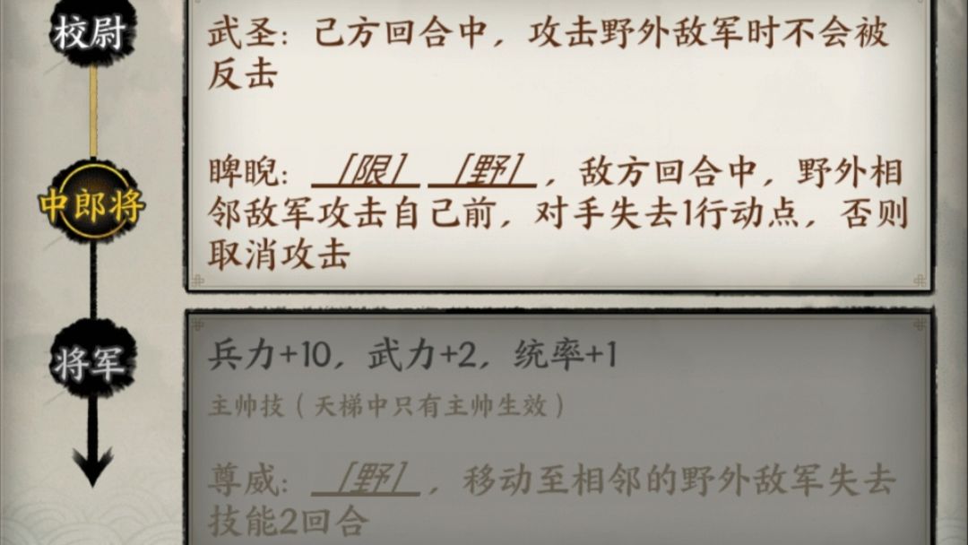 关羽:单兵作战很强,限制敌方行动力,攻击时不会被反击,进阶中郎将后被攻击还会减少敌方1行动点,敌方行动点不足则直接取消敌方攻击