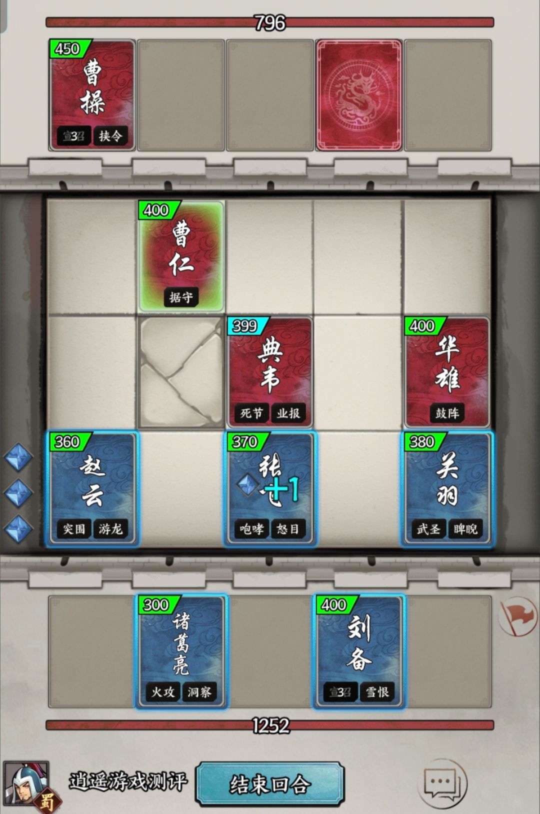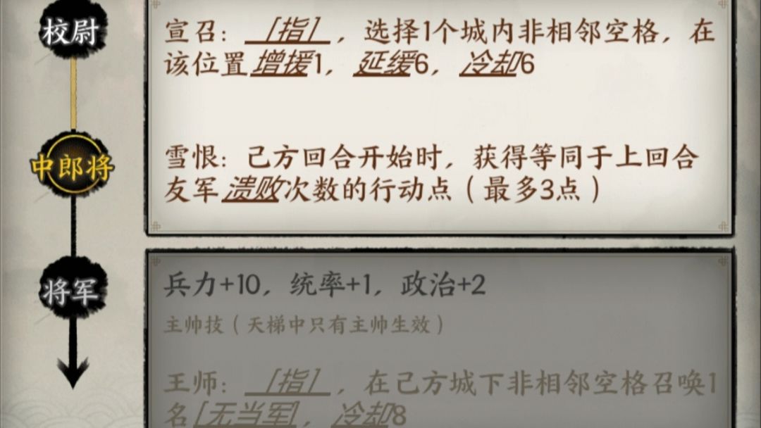 刘备:6回合后可以召唤一名已有的武将援军,冷却6回合,是维持战场战斗力的核心辅助,进阶中郎将后能回复上回合阵亡友军数量的行动点