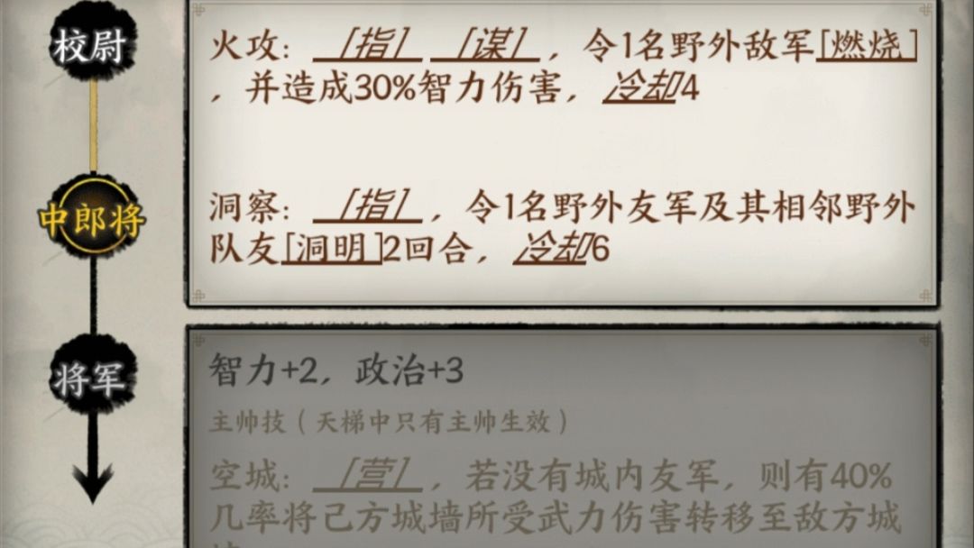 诸葛亮:远程火攻,伤害不高,优点是可以远距离击杀敌方残血武将,进阶中郎将后开的反弹友军受到伤害的洞察技能很强