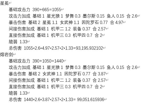 其中间接伤害加成即属性面板中的伤害加成,而直接伤害加成则是机甲三级和四级提供的一共100%的伤害加成。脆弱其实与怪物防御有关,为了方便直接算作1.33,即1/0.75。(拉亚说的)