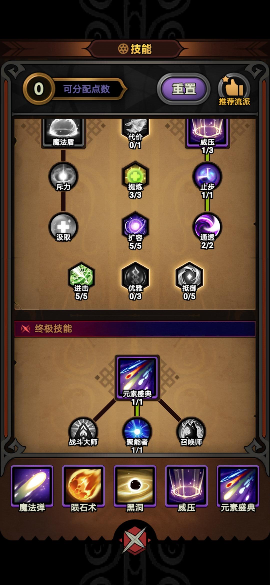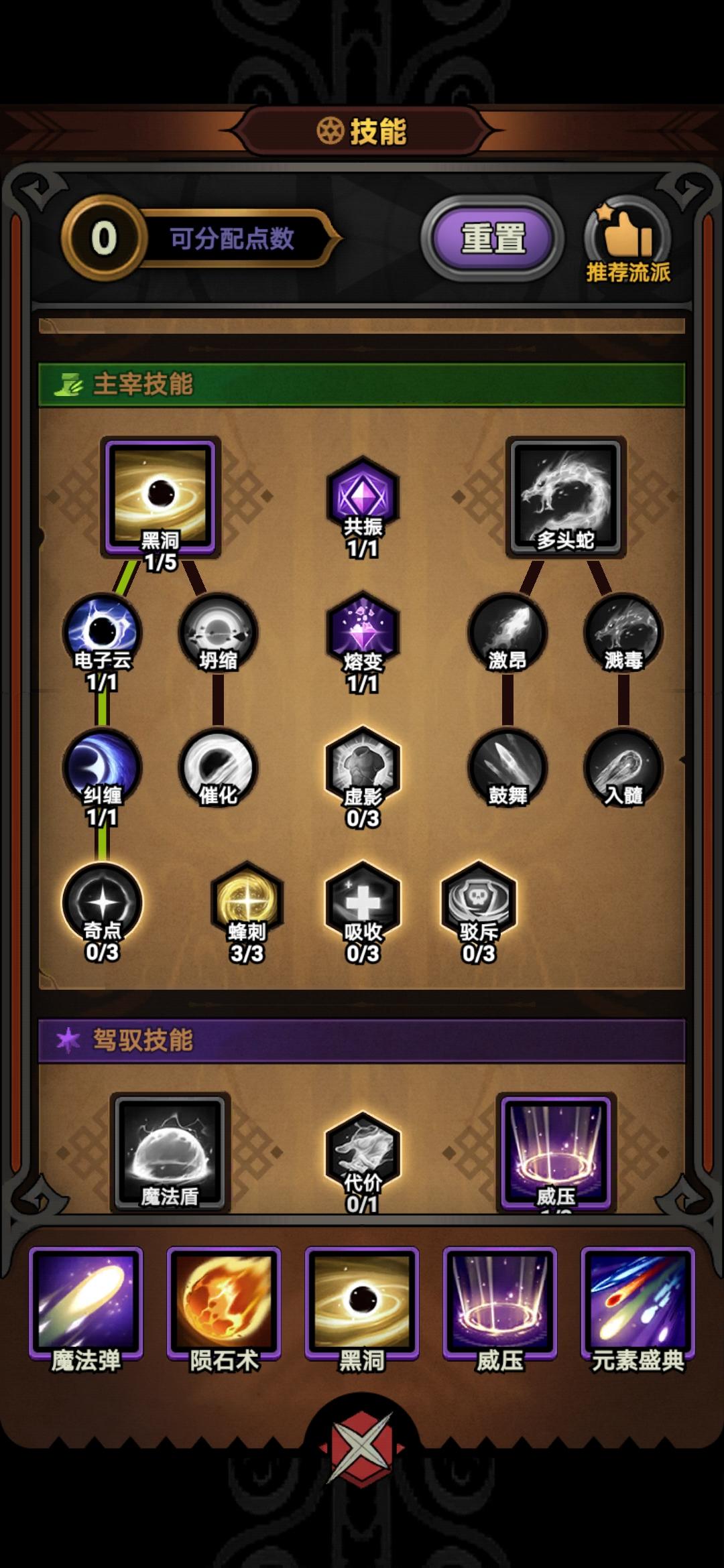 2、技能不要护盾,点黑洞,前面聚怪吃球加能量防止暴毙,再点威压加伤害,不点代价,boss处容易没蓝