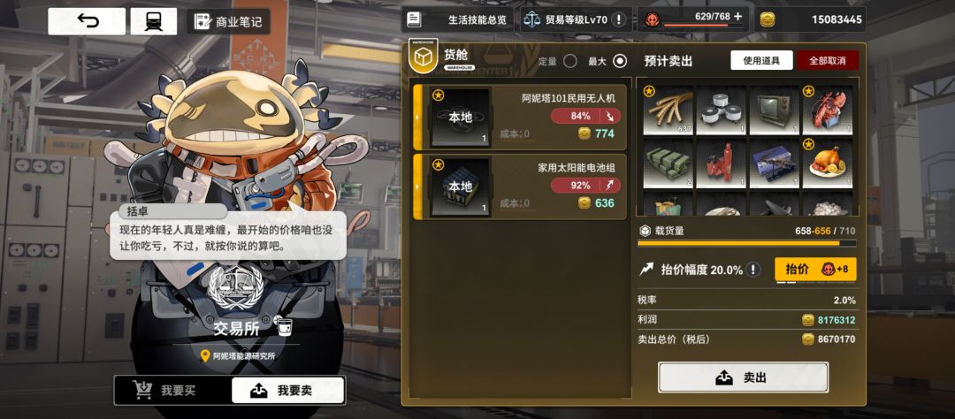 已经在淘金乐园和曼德矿场待了两三天了,为了把之前降价买的金沙消化成金线,今天看物价榜在阿妮塔研究所的价格正合适,我在夕阳下开着我的火车,听着歌,开开心跑火车,因为我终于从那俩地方走了,也因为要赚票大的了,它把我路上捡的其它商品价格压的挺低的,不过无所谓,金线价格摆在那里了,议价提升价格后赚得多,卖掉后我把它的商店都清空了直接,当然依旧要它打折,现在要去其他城市看看,也许要先聚餐一下,如果人生也能够这么简单就好了。