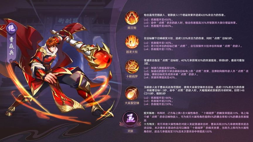 该阵容体系能激活(攻击+10%)与(生命+15%)的属性buff,曹焱兵彩色以后还能为火系队友和自己提供额外的效果,属于中后期极为强势的体系。