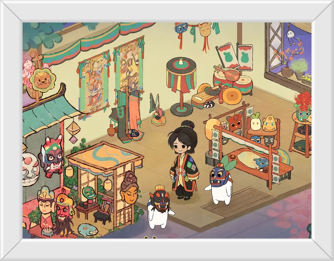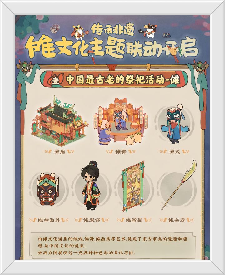 在活动期间,山民前往桃源乡舞台观赏大型傩戏英歌舞演出,参与联动小游戏「思梦千寻」累计参与次数,还可领取联动傩案画、面具摊、傩母神像以及扶光幻形。