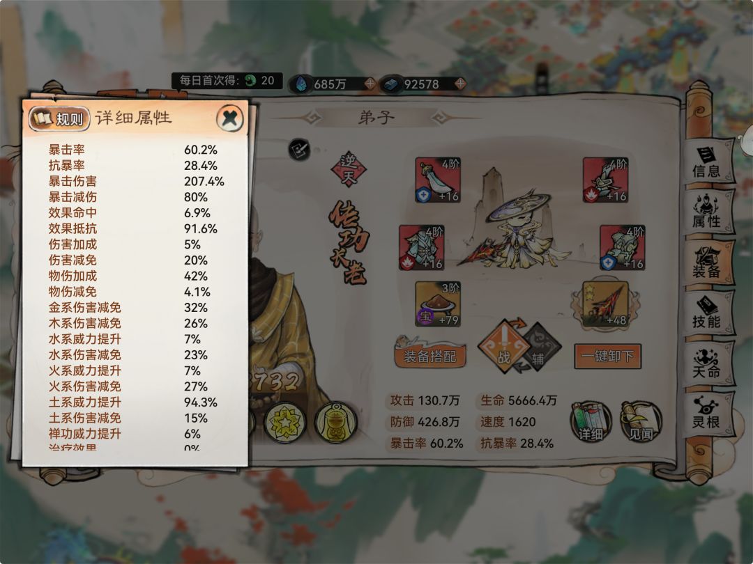天土禅技能带的玄咒和降魔杵,抵抗一定要到100左右,不然无敌、免疫、防御加成、盾啥的都会被虚灵龙驱散。天命无量必须要有,其他的金刚、镇邪也不错,中间的那个天命光华最好,我这个是涅槃、光华、无量。速度最好是尾速。法宝虽然是1000蓄力值,但是配合风灵歌诀、无量或者燃灵被动,经常第一回合就能打出大威天龙。