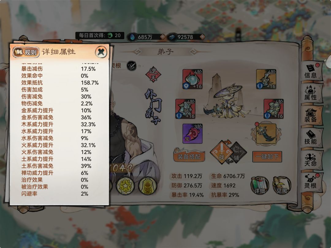 这个禅带的地藏和风灵,变异风灵根,风灵歌诀的变异密藏我刷了接近200的石头都没出,青莲的红色变异密藏都刷出来过。天命是禅心、奇袭(垃圾)、无量。同样抵抗也要150,我这阵容法宝必须用火玉,我这个是火和木的都加了点,炼本命的话可以全木系,风灵歌诀或百花的奶量很足(玉符的治疗效果再加上一些怪癖或特质)。