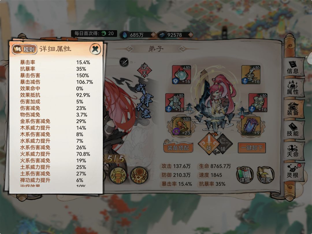 秦冰技能带的风灵歌诀和凤魂,在我这个阵容的作用就是风魂复活以及风灵加35%法宝蓄力(也可以换成其他的功法),不过秦冰的自带技能不太行,会给对面敖天叠被动,后续有资源了试试紫灵。秦冰的抵抗也很重要,感觉要100以上,我这个变异了冥灵根但没资源升级了,暴减和抵抗都还能加8左右。本名法宝我用的加暴击减伤的,主法宝三阶火果,加生命上限的那个,副法宝二阶火鳞,可以切换着用,这个其实无所谓,自己有什么就用什么,微氪本命法宝随缘,我天土禅都没本命用。