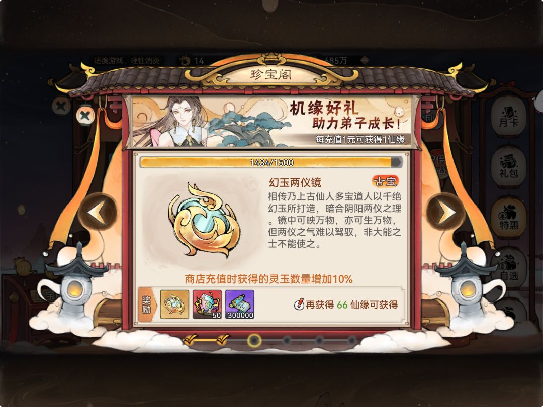 灵玉千万别屯,九层、炼丹、仙缘寻访1000挡的买完。九层我每次活动都抽完的,感觉有点亏,不过这活动是拿橙书和紫书的主要途径,屯的话书少很多,五个橙色古宝我已经觉醒,5%伤害以及5%效果抵抗还是不错的;炼丹大会抽出凤魂和地藏就可以屯了,我屯的400抽开抽,后续又买了点2000挡的,现在霞伞一星,灾星两星,后续要屯到上千抽了,一次性拉满,也不知道还能玩多久。。。还有遇到能换石英的一定要换,我两个仙缘弟子早就仙三了,而79级的3阶法宝才刚刚两个,不过最近活动送的石英很多,又屯了70个了,可惜玄铁都被我送给那些附庸宗门了。。。