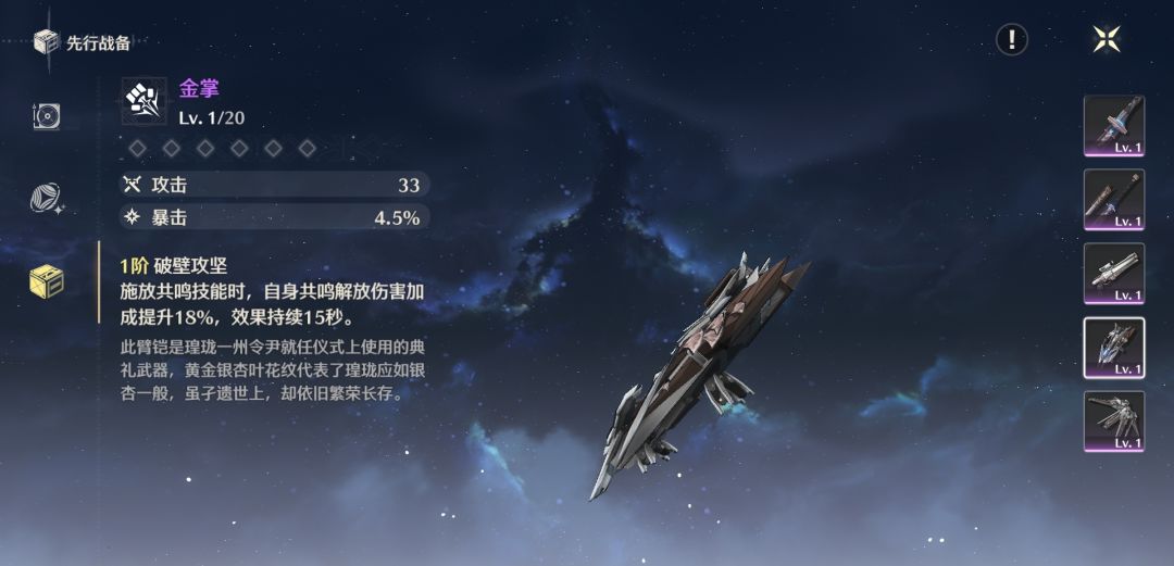 四星武器首选金掌,作为大月卡武器,拥有暴击率词条,更好地缓解词条压力。
