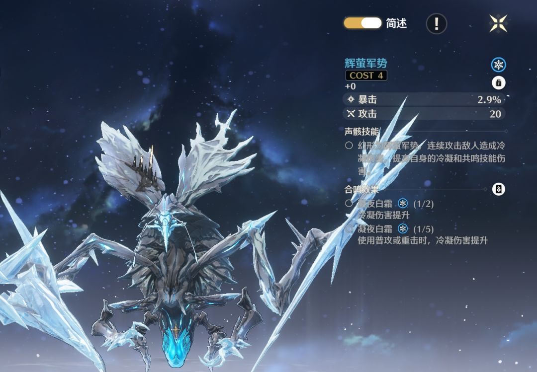 一号位首选辉萤军势,辉萤军势的声骸技能享受角色自身属性加成,而且可以为自身提供冷凝伤害和共鸣技能伤害加成。cost4主属性首选暴击/爆伤,cost3优先选择双冷凝词条,也可选择冷凝+攻击或者攻击+攻击过渡,而cost1词条都是选择攻击。副词条优先选择暴击率,再是爆伤,然后是攻击,最后普通攻击词条和共鸣效率均可,凌阳对于共鸣效率有一定需求。声骸套装优先凑齐凝夜白霜,过度选择2白霜+2攻击(不绝余音)。