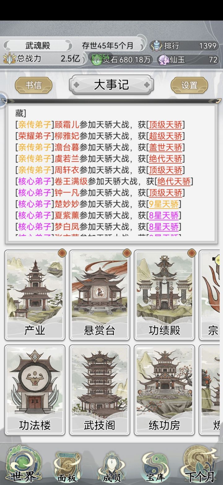 高级进阶版补充:该有的攻略大家都出了,只说天骄大赛,以上是2.5亿和5亿的测评,半神5级以前如果参赛,天骄等级比较随意,囊括了超级天骄-无敌天骄,半神5级以后参赛,基本上是绝代天骄和无敌天骄,神级以上没测过,大家也可以自行测试(养眼专用),,,,,,以下是低阶版攻略: 1:开局选弟子不用刻意红色,有时候金色也很好,颜色随着运气增加是会变红的,主要看天赋,自带天赋最高十级,优先级别:卷王-莽-痴情种-剑骨,功法,魂兽,丹药类等增加战力和修炼速度的类型,不必强迫刷满级天赋,比如天赋带9级的卷王和8级的莽,就比单独10级的卷王要好用