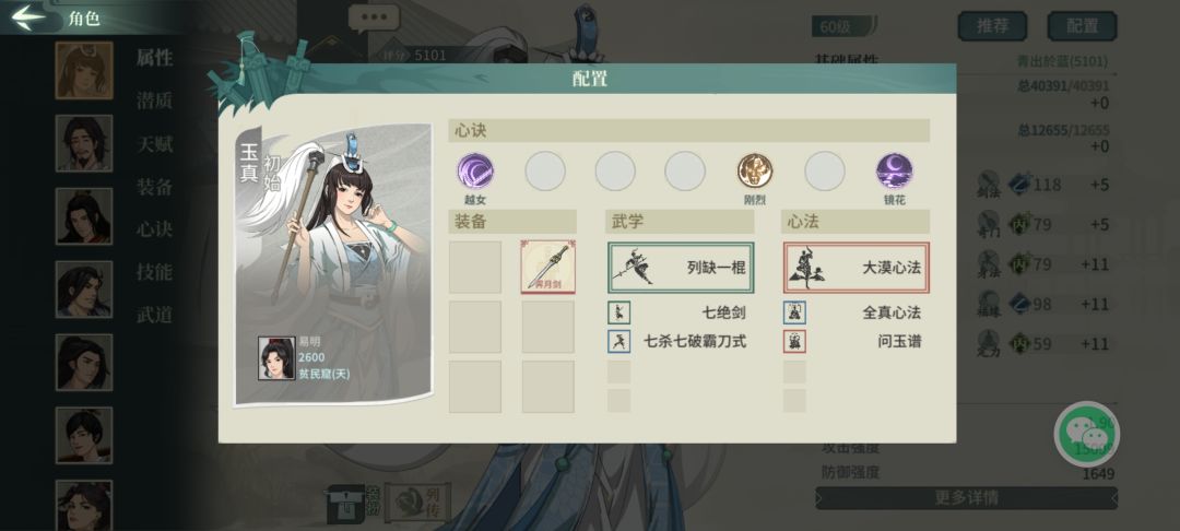 这个配置是我看了列缺刺杀套路之后进行优化的结果,总共消耗3怒气,没有任何不稳定因素,且武学心法无参研装备无洗练。全程出手2次,耗时也是最少。天赋选择兵贵神速和等级碾压。