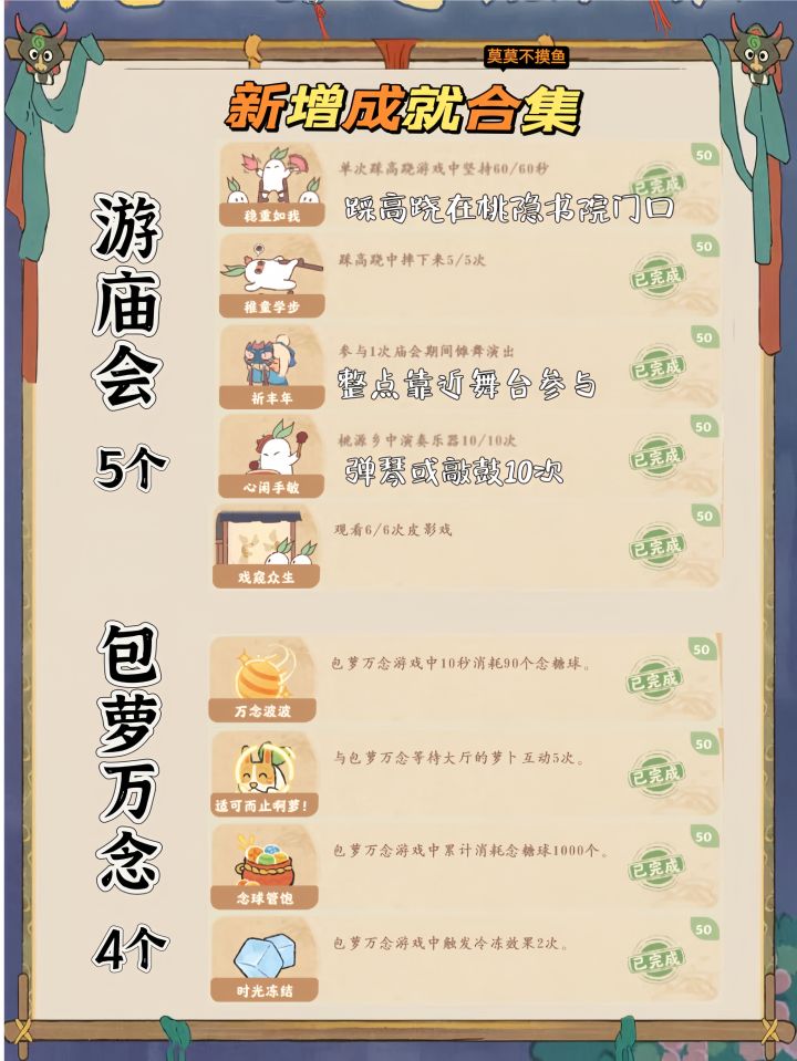 1、新活动「游庙会」在桃源乡新增成就5个。