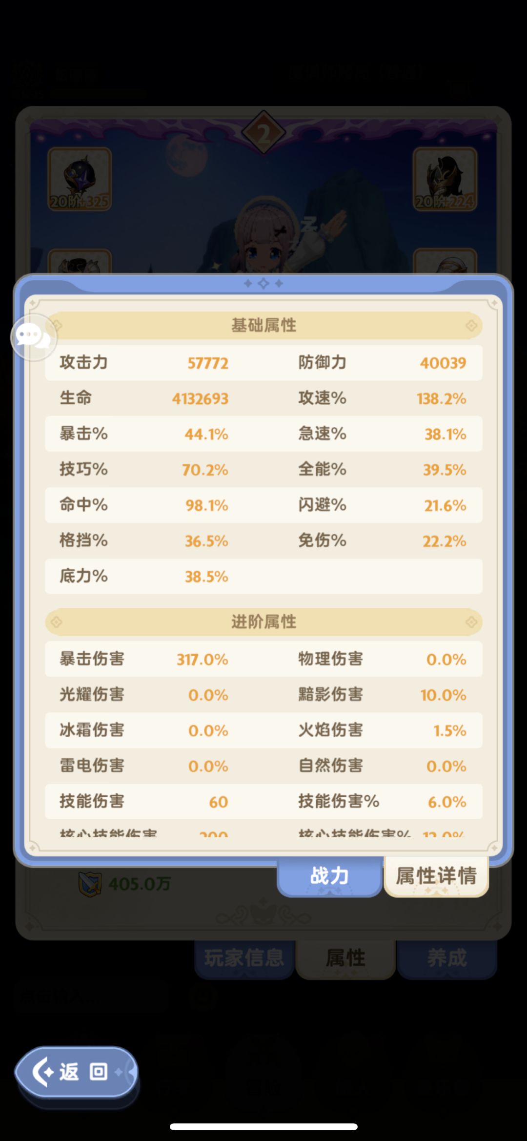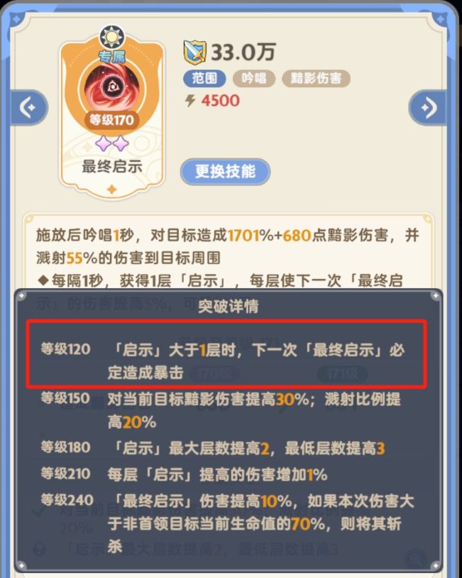 这里注意技巧尽可能高,暴击属性没有那么重要,因为核心技【最终启示】120级的效果是可以必爆的,这个时候就只需要优先叠技巧,尽可能打出更多的巧爆。