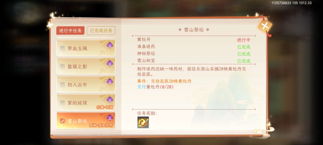 1.主线雪域北疆-养荣回春,需要4份养荣丹,任务介绍见图2,养荣丹材料见图3,玩家需根据图1提前采集好对应材料。