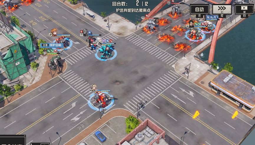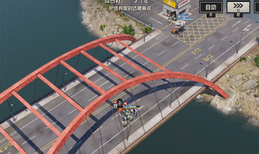 本关任务是保护肖妮撤离,开局我方处在路线交叉处,左边支路为撤离路线,右边支路为敌人追击路线,成就目标凯莉也在其中。所以本关我们可以采用兵分两路的思路,一路护送肖妮往左边撤离,另一路往右边消灭前来追击的敌人
