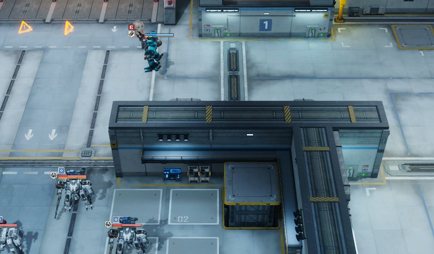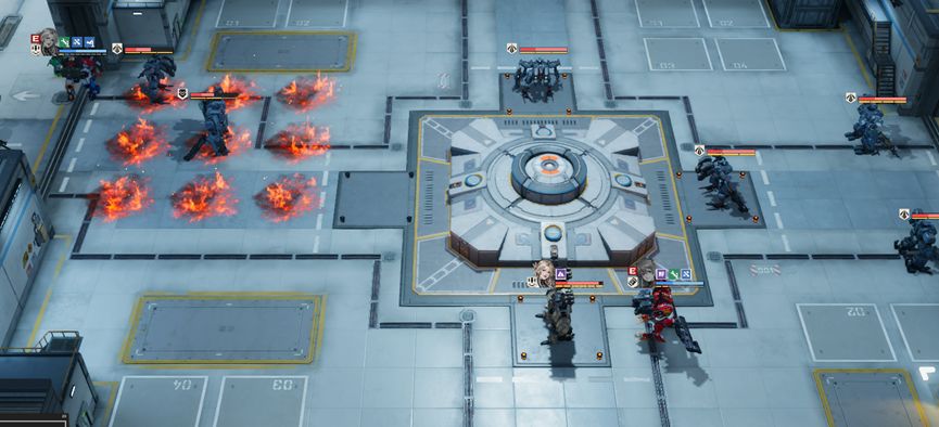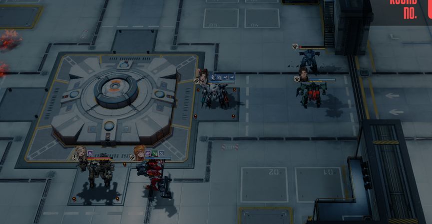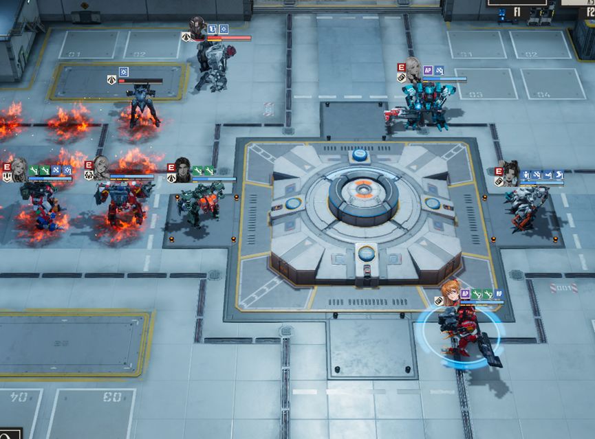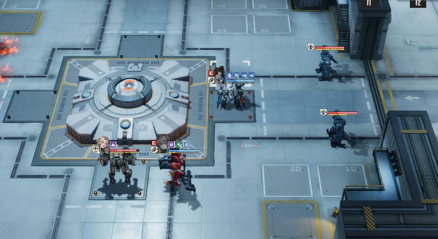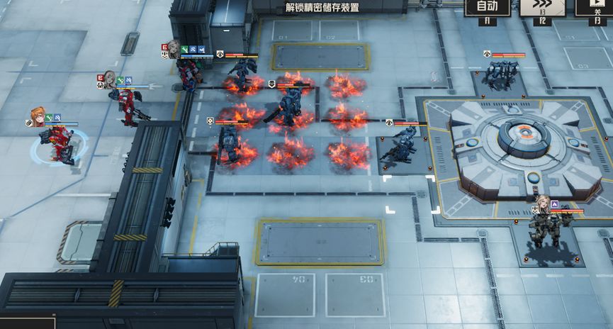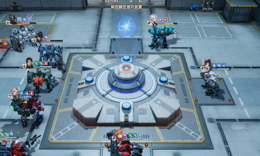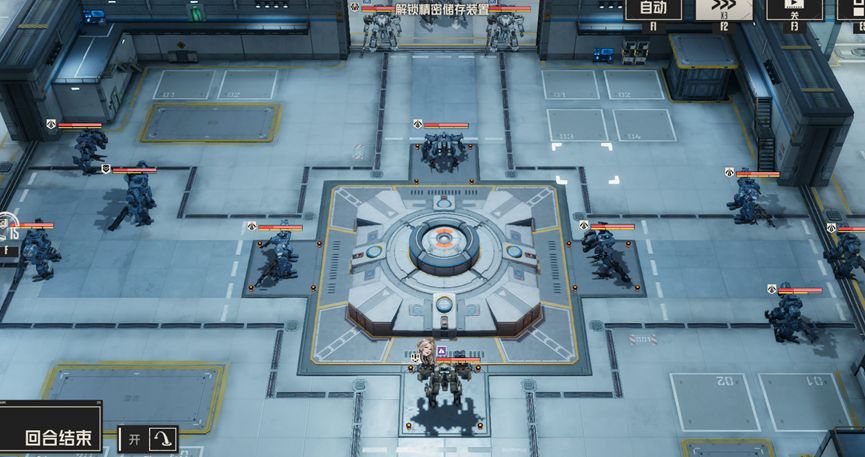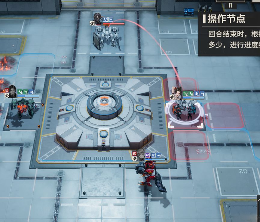 我方人员分为两组分别位于左右两边,开局之后,两边人员需要尽快地清理两边大门处的敌人,以快速进入到房间中参与据点的争夺。而四个据点初始已经被敌人占领,我方需要尽快将据点上的敌人消灭,而之后周围的其他敌人并不会马上重新占据,所以我方前面只需要确保有一两个机师能够占据即可,而不必强求全部占领,最终要的是确保得分及不失分
