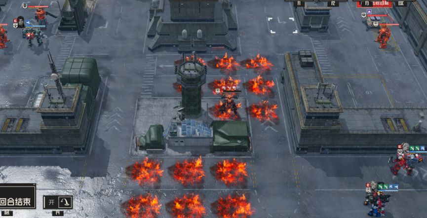 明日香利用中间格斗兵位移到右边,优先将右边的电磁炮兵消灭,信号塔下回合处理