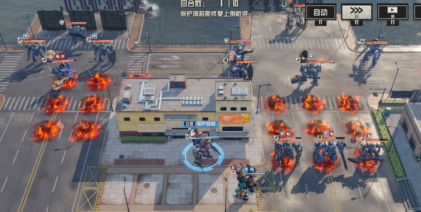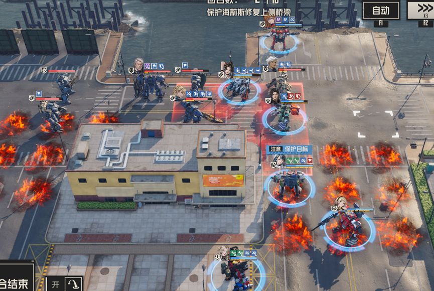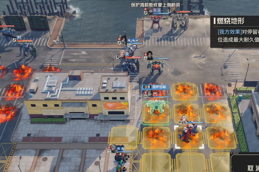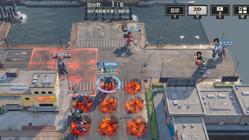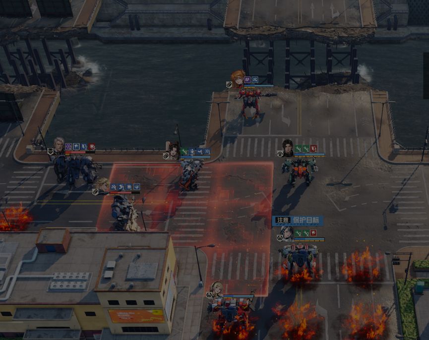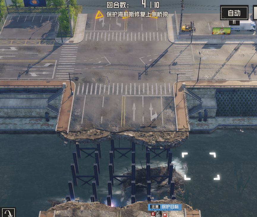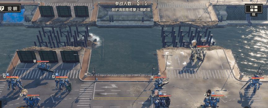 本关任务是保护海莉丝修复桥梁,这里有两座断桥,但是左边桥梁被挡板挡住了,所以要修复的是右边的桥梁,但是其实我们把所有敌人都消灭,也是能够通关的。难度方面并不是很大,敌人数量不多,距离我们也比较近,不需要怎么赶路,几个首领虽然血量较高,但是伤害不高,围攻即可拿下,海莉丝也是我方可控的,基本不会有生存威胁。需要注意的,就是最后一波敌人会刷新在对岸,我方需要有能过河处理对面敌人的机师手段,例如携带飞行背包,或者明日香跃袭等等。