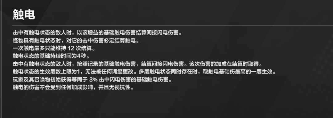 第二个问题 就是触电是击中附加的另外一种伤害,之前我一直以为触电是持续伤害,毕竟结算上限12次.但是搞清楚了是触电属于间接伤害的闪电伤害,也就是可以理解成附加伤害.比如打0.5兆,那么附加就是0.5*0.03=0.015兆,单次总伤害就是0.5+0.015=0.515兆.