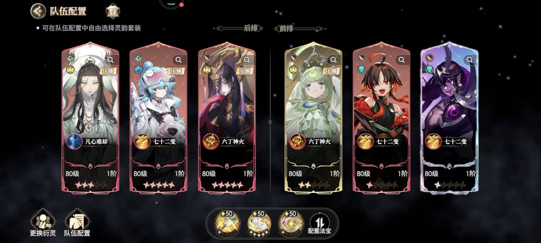 地藏王、多罗的灵韵一定要携带六丁神火。九头虫衰竭、红孩儿三昧真火、芭蕉扇灼烧、绝三孟婆大招快速循环,稳定给六丁神火增伤。因为后排生存压力小,多罗菩萨假死会进入无敌状态没有生存顾虑,六丁增伤非常明显。孟婆没有绝三的可以换成凡心,通过法宝回能来加速循环。